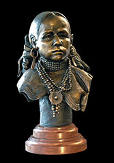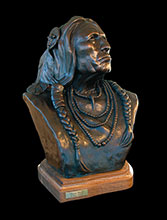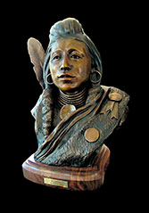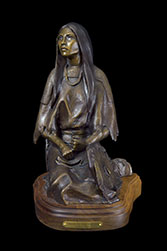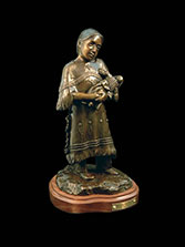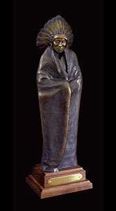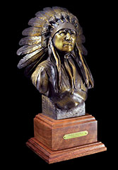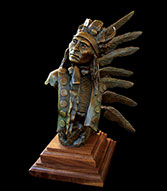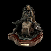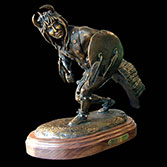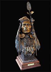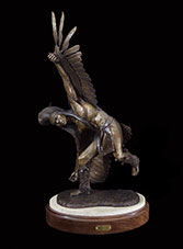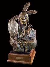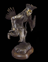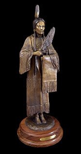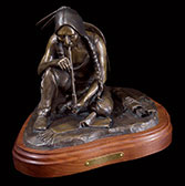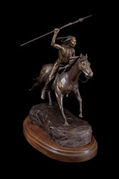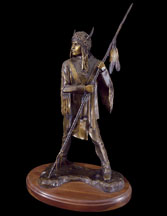This piece depicts a Blackfoot sentinel standing guard, protecting his people. Originally living in the northern Great Lakes Region, the Blackfoot was one of the first tribes to begin moving Westward. Thought to have been pushed out by their arch enemies, the Cree Indians, as well as westward expansion, the Blackfoot began to roam the northern plains from Saskatchewan to the Rockies. In the spring, when the buffalo moved out onto the grasslands, the Blackfoot followed. During the summer, the Blackfoot lived in large tribal camps, hunting buffalo and engaging in ceremonial rituals. In mid-summer, the people grouped for a major tribal ceremony, the Sun Dance.