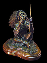 This piece depicts a Lakota warrior on a vision quest. A traditional Native American vision quest consists of a person spending one to four days and nights secluded in nature, usually at the top of a hill or butte. They typically will fast and not sleep for the duration of their quest.This provides time for deep communion with the great spirit and a search for self-identity. During this time of intense spiritual communication a person can receive profound insight into themselves and the world. This insight, typically in the form of a dream or vision, relates directly to their purpose and destiny in life. They would council with the medicine man after their quest, and he would interpret their vision to give them direction for their destiny.