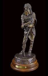 This piece depicts a mountan man of the early 1800’s, taking a break from checking his trap lines. He spent most of his time in the wilderness of the Rocky Mountains hunting and trapping for furs. He interacted with Native Americans frequently, trading with them for supplies. He lived a solitary life and depended on his own resources for food and shelter. He carries his powder horn, knives, pouch, etc., and his French musket was his constant companion.